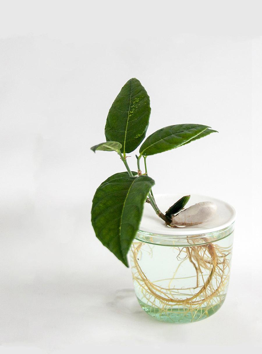 Placez le pépin germé sur une coupelle à germer - comme celle-ci - posée sur un verre d’eau, en veillant à ce que la racine touche l'eau. Attendez quelques semaines avant d'avoir la joie de voir apparaitre les premières feuilles!