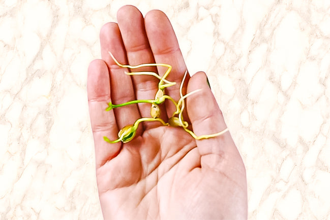 - Au bout de quelques semaines, vous verrez apparaitre la première racine. Attendez qu'elle mesure quelques centimètres pour sortir les pépins du sachet.