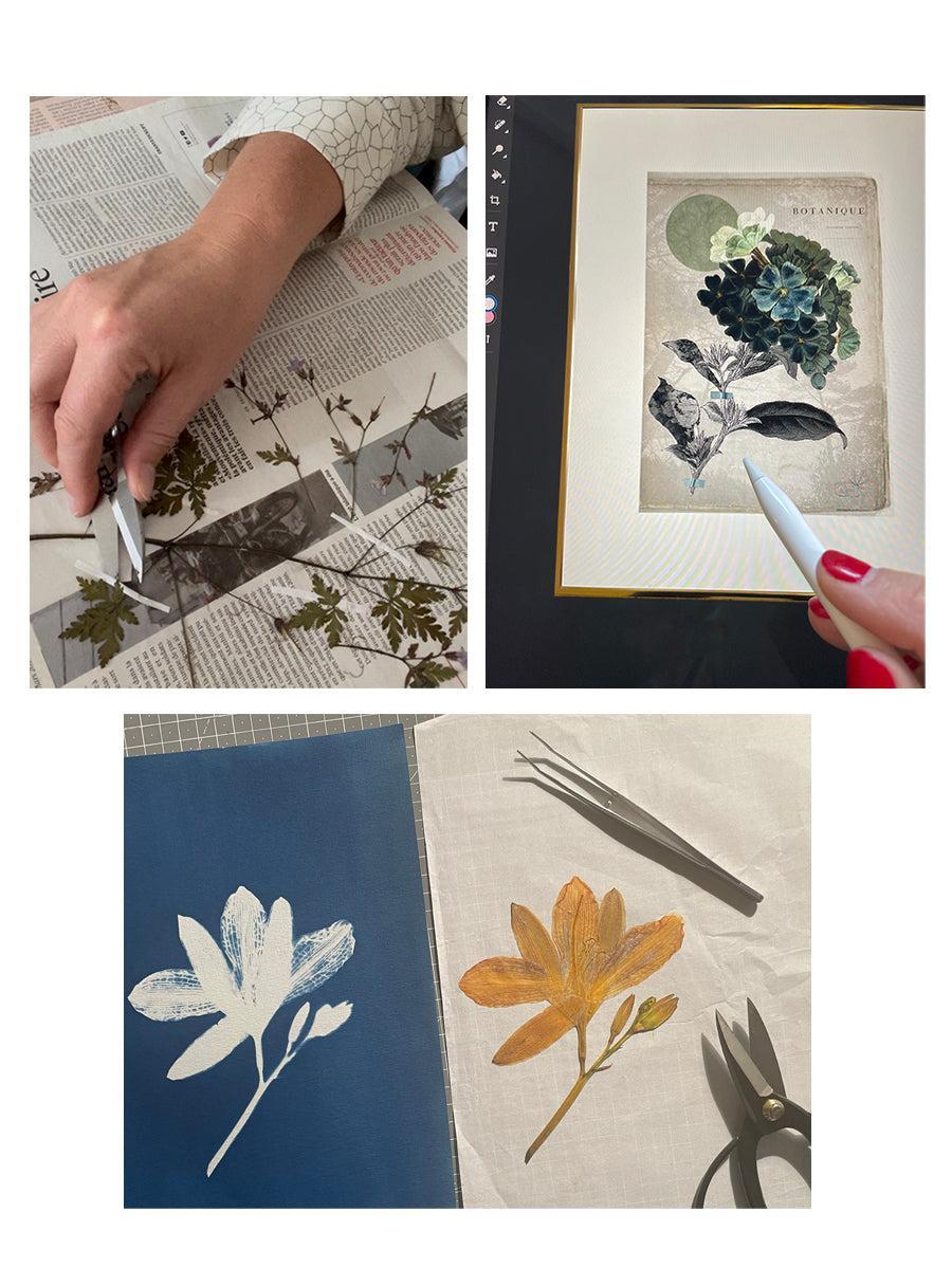 Dans mes collages, j’utilise ces végétaux pressés et séchés ou leurs empreintes réalisées en monotype ou cyanotype. Ces fragments découpés sont ensuite mêlés à des papiers d’art pour créer des compositions uniques.